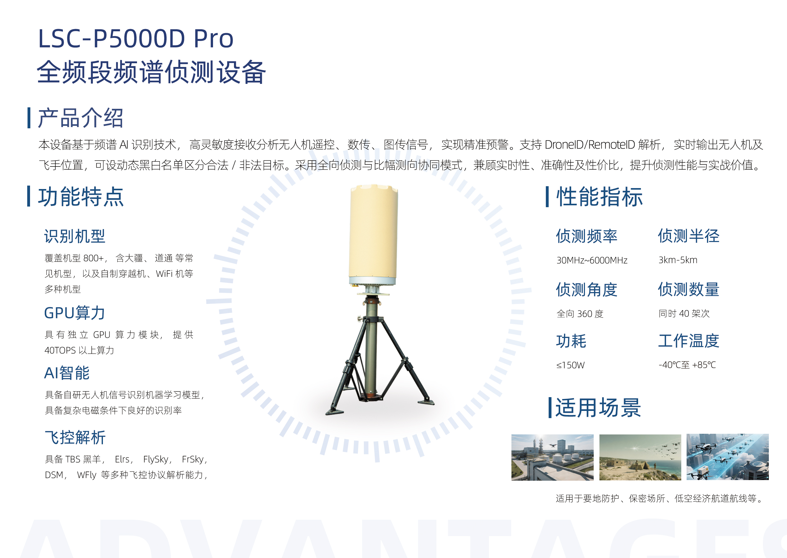 全频段频谱侦测设备基于先进的频谱AI识别技术,通过对无人机遥控、数传、图传等信号的高灵敏度接收与智能分析,实现对无人机的精准预警与探测。系统具备对DroneID、RemoteID等广播数据的深度解析能力,能够实时输出无人机及其飞手的精确位置信息,并支持建立动态黑白名单机制,有效区分合法与非法目标。采用全向侦测与比幅测向相结合的协同侦测模式,兼顾侦测的实时性、测向的准确性及系统的性价比,显著提升了整体侦测性能与实战应用价值。